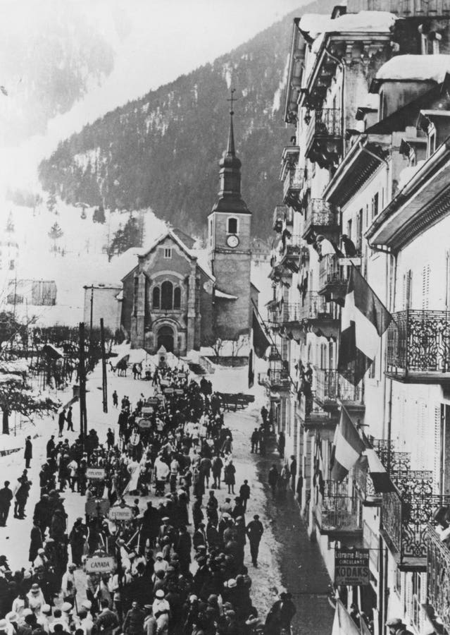 Delegates of the competing nations gathered near Saint-Michel Church and the Hotel de Ville for the opening ceremony of the 1924 Winter Olympics in Chamonix, France, 25th January 1924. (Photo by Topical Press Agency/Hulton Archive/Getty Images)