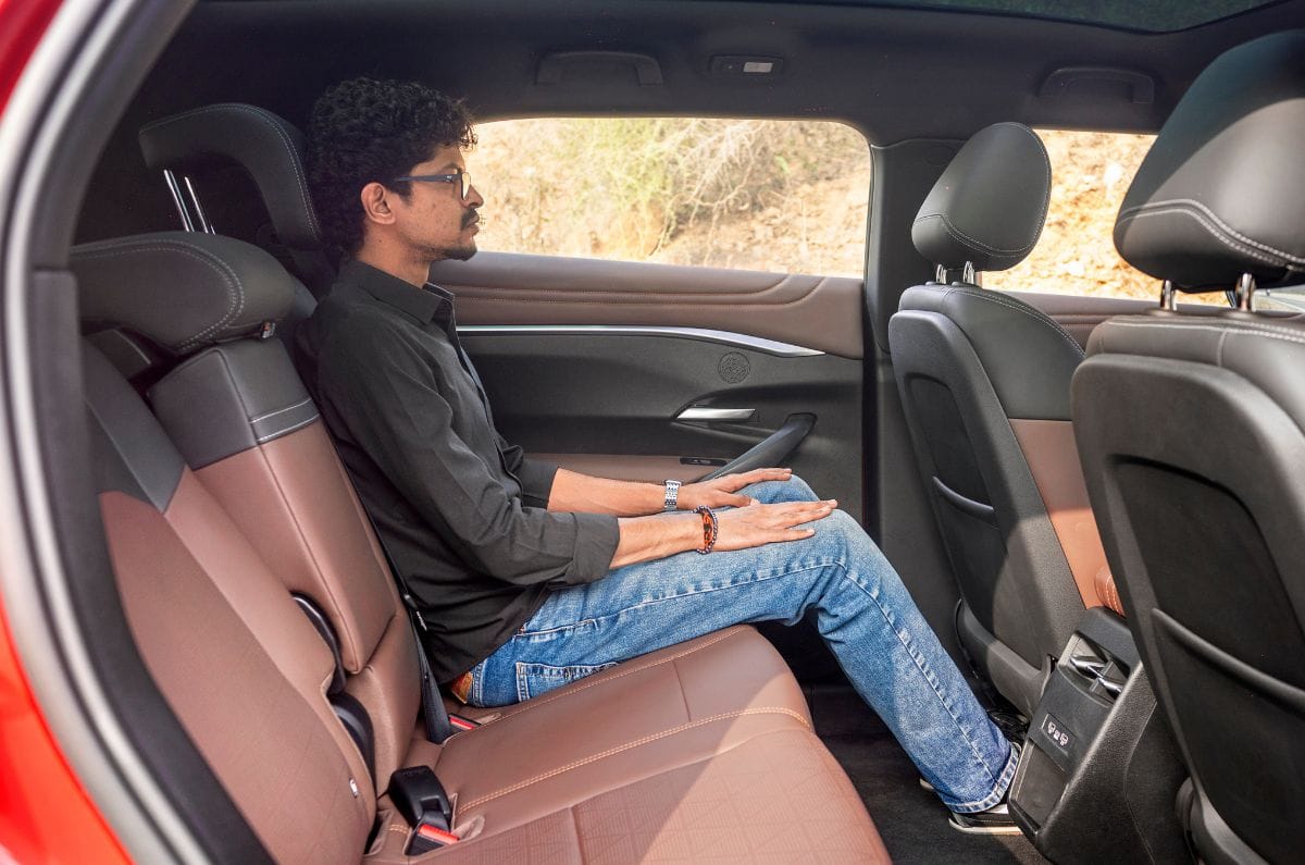 The dual-tone brown and black upholstery with orange stitching lends the cabin a premium look and so do the vegan leather inserts on the dashboard and door cards, which are soft to touch. You’ll also find a few bits from the BMW parts bin like the indicator stalks and door handles. However, some of the plastics in here feel hard and scratchy. Still on the whole, the cabin impresses with its fit/finish levels, but like the exterior, lacks the requisite wow factor.