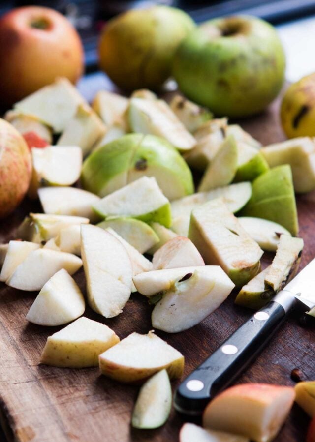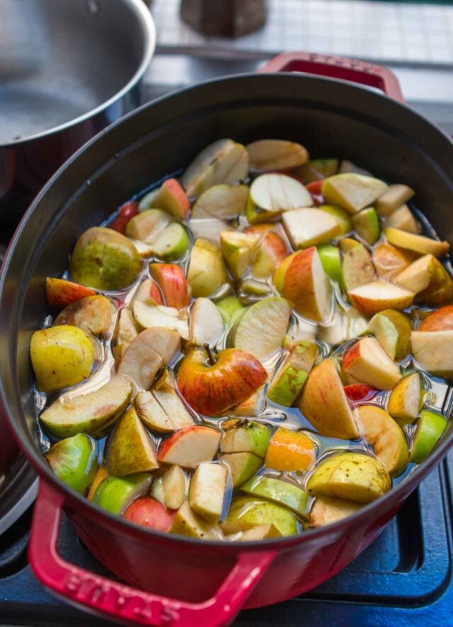 Add the water, cover, and bring to a boil. When bubbling, reduce the heat a bit, leave the lid askew, and cook for 20 to 30 minutes, until the apples are tender and cooked through.
