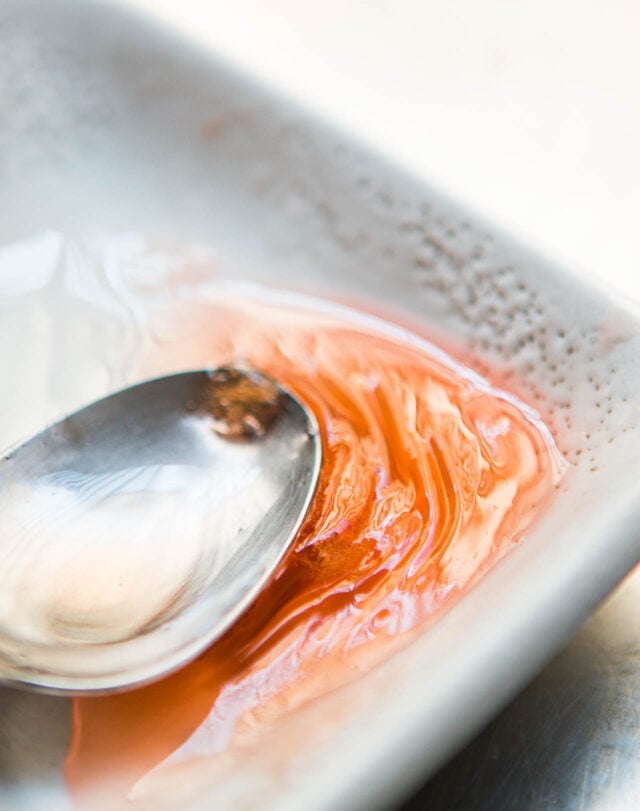 Cook until the temperature reaches 220ºF (104ºC). At that point, turn off the heat and begin testing the jelly on a chilled plate in the freezer, using the method mentioned in the headnote. When it wrinkles and holds its shape, it’s done. If not, continue to cook and re-test it at intervals. This batch set at 230ºF (110ºC).