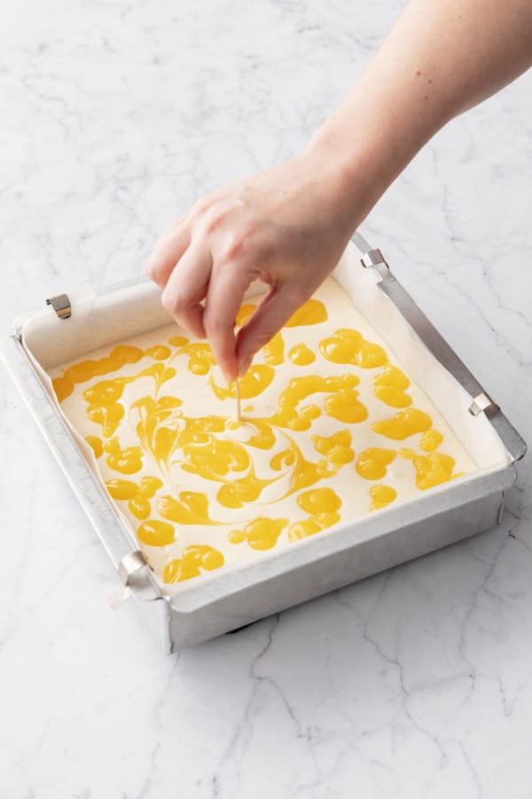Pour batter into still warm crust, spreading into an even layer. Drop dollops of lemon curd over top of batter, and then, using a toothpick or skewer, swirl the curd into the batter (try not to go so deep that you touch the crust if you can).